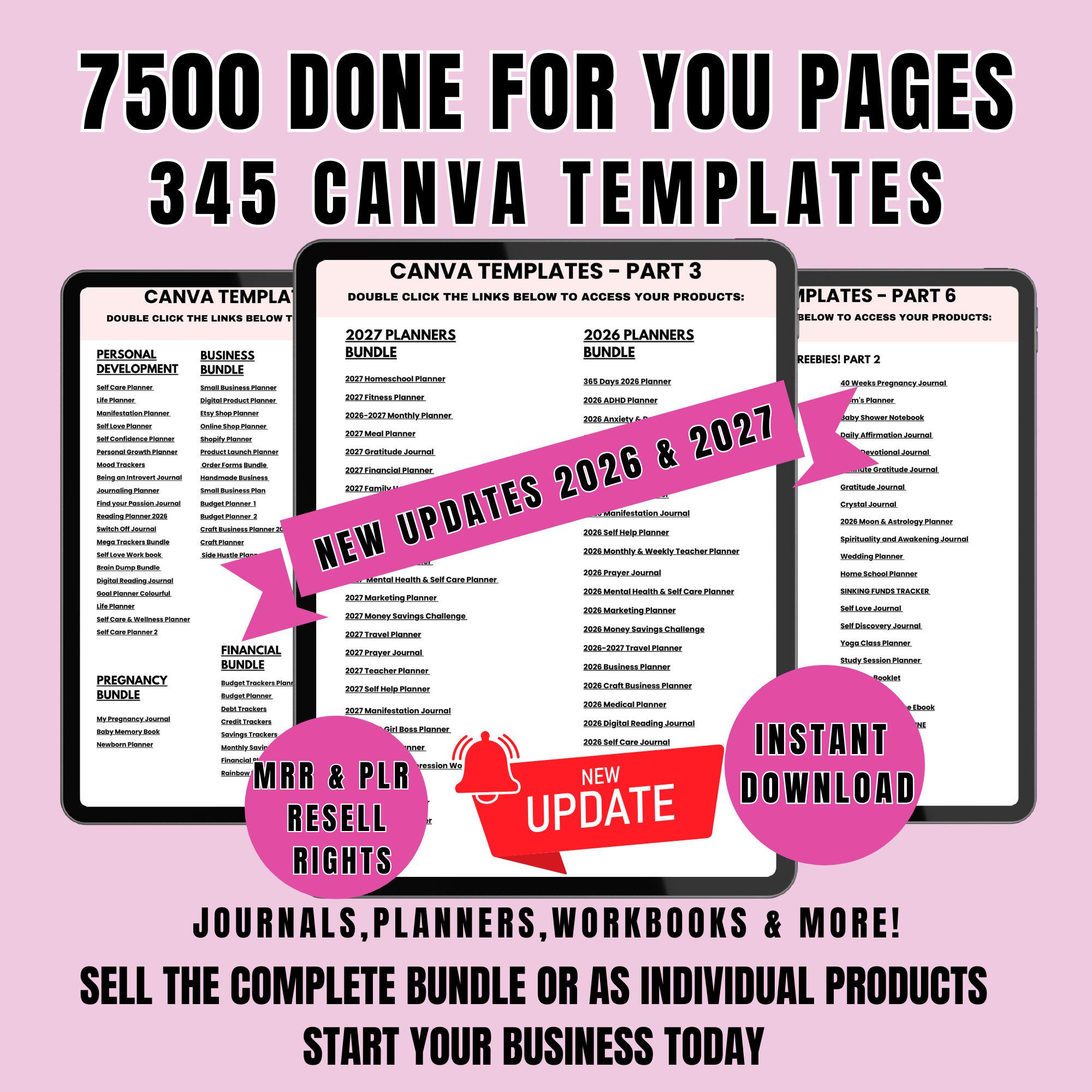 Access a large collection of 7,500+ ready-to-use Canva pages and 345 editable templates including planners, journals, trackers, and more.