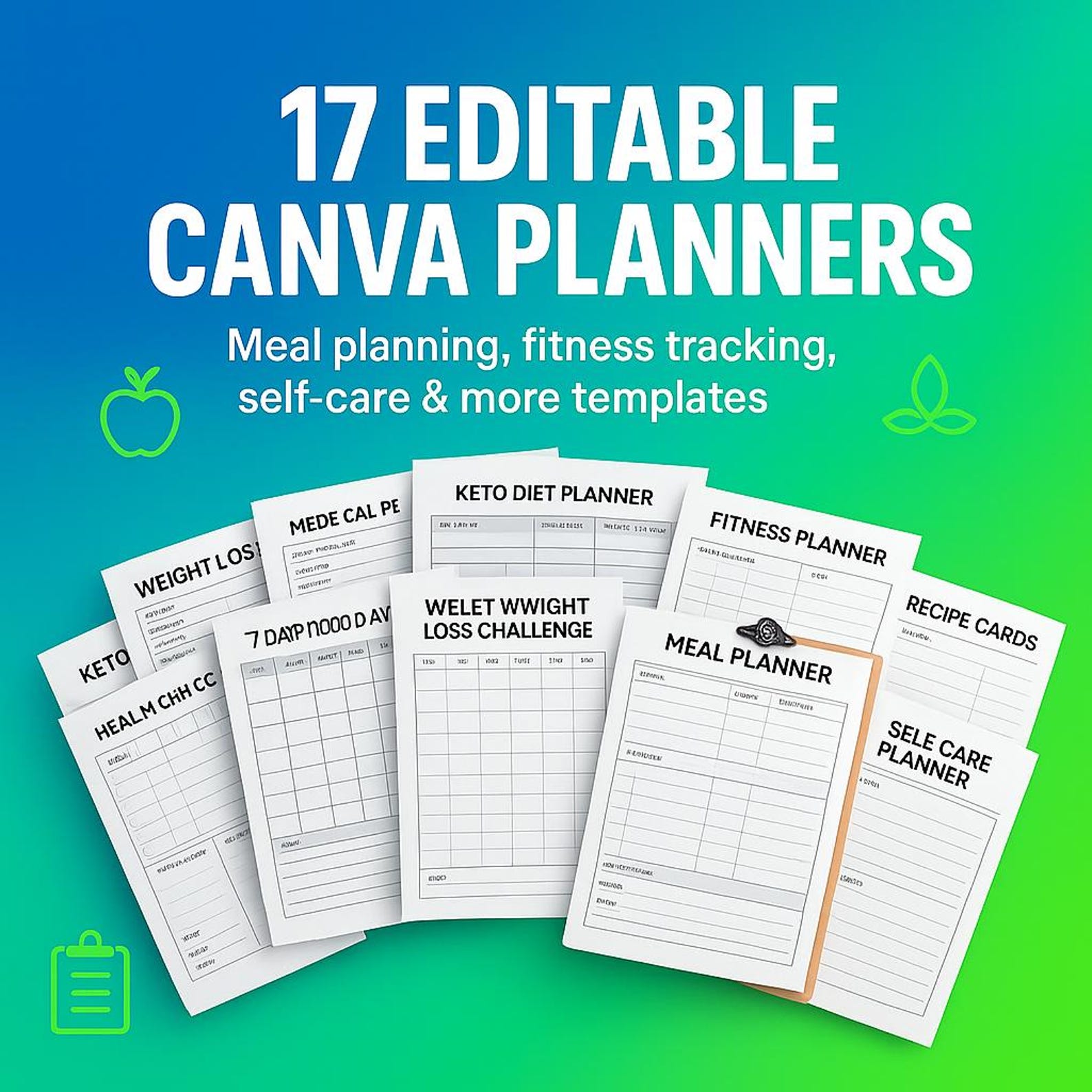 - 📋 17 Canva Template Planners — Weight loss, fitness, nutrition, meal prep, medical logs, self-care & more